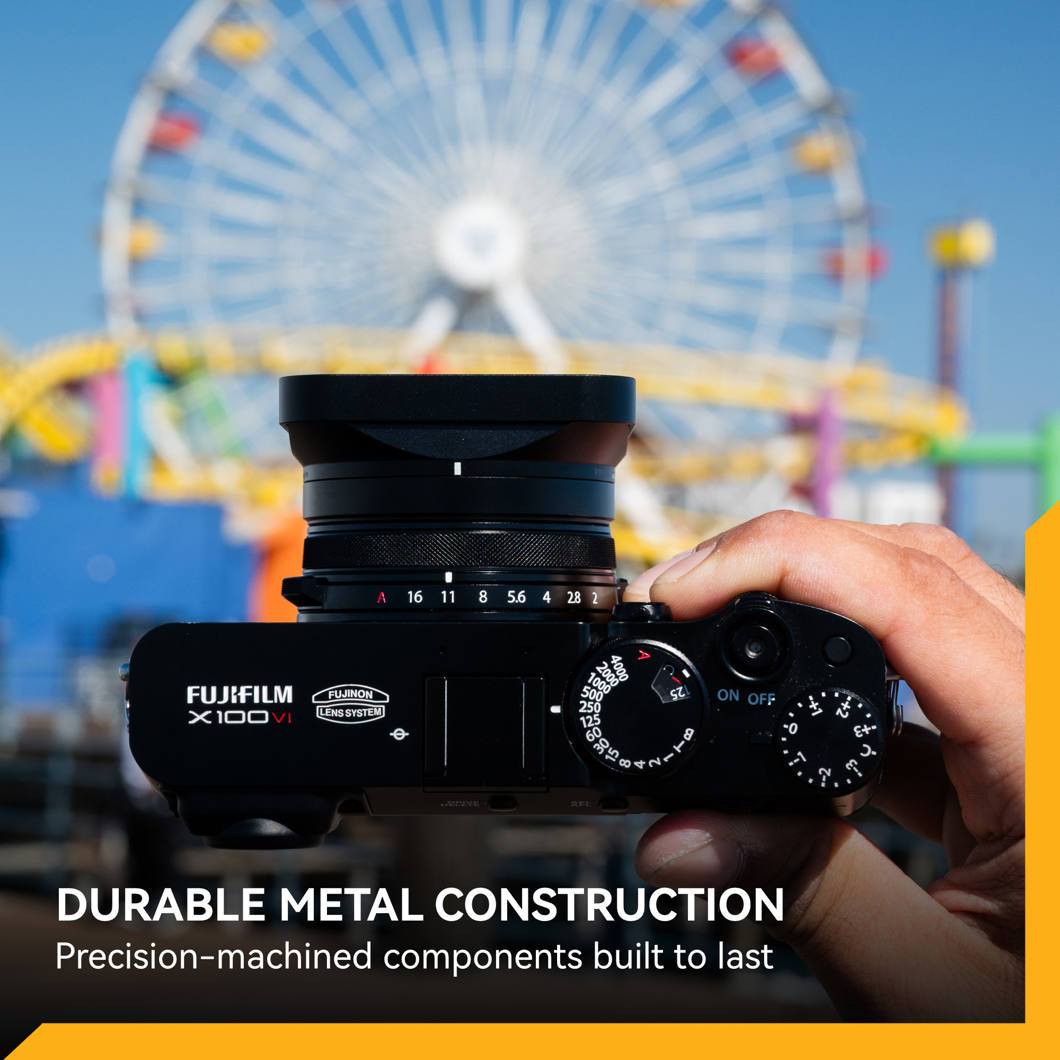 - Magnetic Square Lens Hood - The true innovation of the JetMag kit is its magnetic hood. Once the UV filter adaptor is in place, the square metal lens hood attaches instantly with a secure magnetic mount. The hood helps control stray light, reducing flare and preserving contrast, while its sleek design complements the X100’s timeless aesthetics.